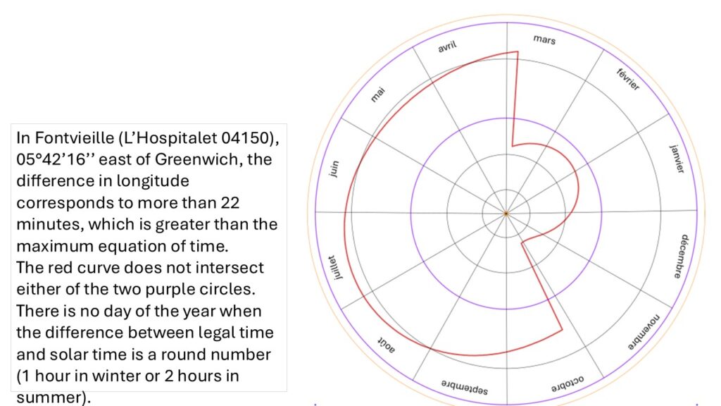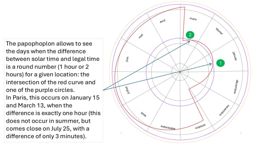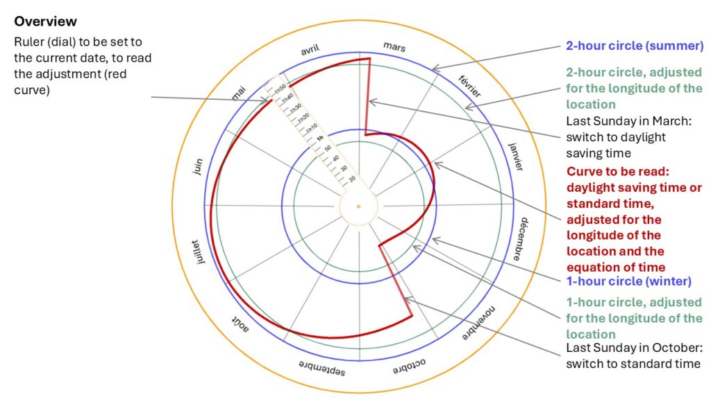 For example, in the previous image, we read that on 10 May in Paris, we must add 1 hour 47 minutes to solar time. So at solar noon, it is 1:47 p.m. on the watch.