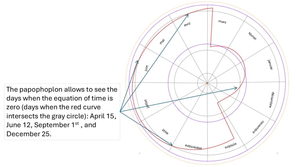 In other words: what time is it on my watch when it is solar noon? This is the first function of the papophoplon: since we know the difference between the watch and the dial and we know that the adjustment always consists of adding this difference to the dial time, we simply read this adjustment as the watch time.