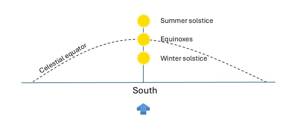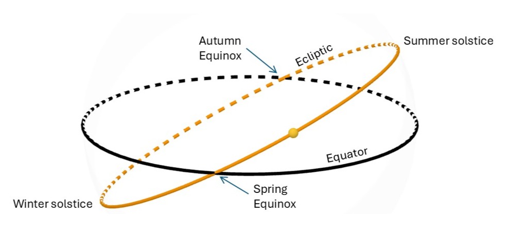 If we tilt the previous diagram slightly (positioning the equator horizontally), we see that the Sun appears to be at its highest above the equator on the day of the summer solstice and at its lowest below the equator on the day of the winter solstice. The apparent position of the Sun during the spring equinox is called the vernal point. On the other side, we see the position of the autumn equinox.