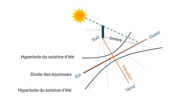 L’extrémité de l’ombre d’un gnomon trace une conique sur un sol plat. La courbure de cette hyperbole varie tout au long de l’année. Deux fois dans l’année, à l’équinoxe, la courbure est nulle et la trace du gnomon au sol est une droite, parfaitement alignée Est-Ouest. C’est sur ce principe que repose la méthode.